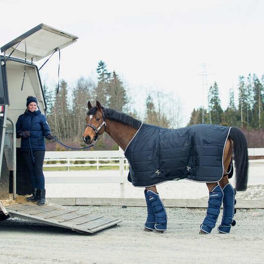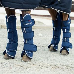 Protect your horse's limbs during trailer rides at your next competition.These soft transport gaiters are reinforced with foam to better support the horse's limbs during transport. They have been lengthened to provide good protection to the hoof and prevent injuries caused by shoes. The reflective piping on the back improves visibility at dusk. These beautiful transport gaiters are perfect for any weather and increase your safety, allowing your horse to arrive at his destination in good shape.Features:Durable outer shell with high-density protective foam3 adjustable velcro closuresQuick dryingHind gaiters have elastic joints at the top strap to allow for freedom of movementReflective piping on the center line to ensure good visibility in the darkThe lower part of the gaiter is reinforced to protect the horse's hoof and prevent injury during a transportLogo B Vertigo and flagThe set of 4Technical description:Exterior: 600 denier ripstop, PU coating, 100% polyester.Washing instructions:Wash with other similar colors at 40°C. Do not use bleach. Iron at low temperature. Do not tumble dry.article code: 19514